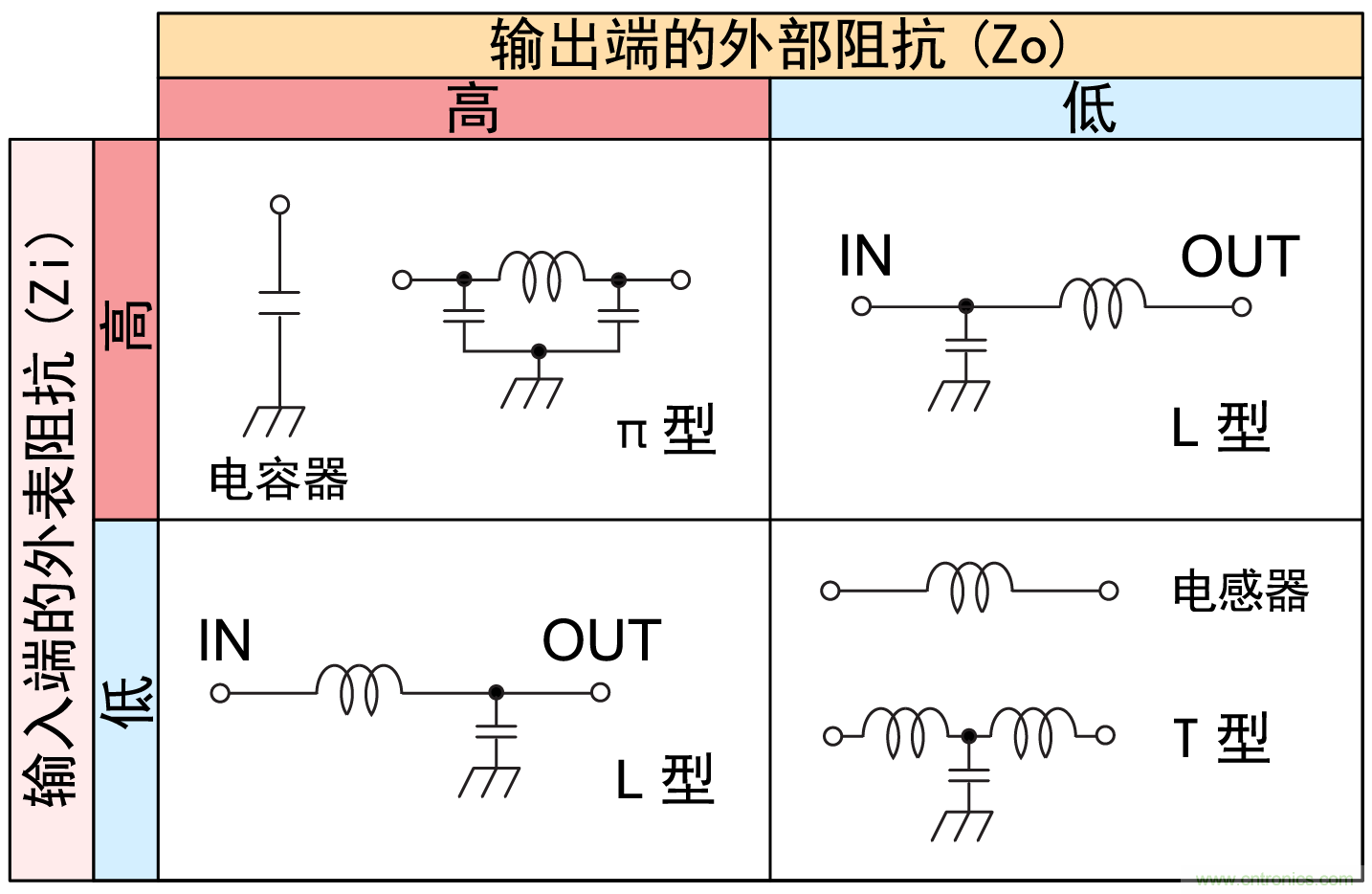 另 一方麵,電感器具有所謂的用高阻抗使高頻噪聲反彈的作用,因此電感器與高阻抗部分相接則效果差,反之與低阻抗的電路相接則效果好。此原理歸納於圖2中。圖 中顯示了輸入端阻抗和輸出端阻抗的高低和該條件下噪聲除去效果好的濾波器結構。從圖中可以看出,對於L型濾波器這類不具有對稱結構的濾波器,若輸入輸出端 接反,則效果發生變化。使用時應加以注意。