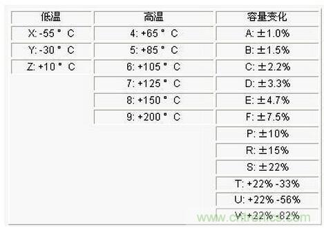 按極性分為:有極性電容和無極性電容。無極性電容(主要指陶瓷電容)的參數(電介質材料類別,溫度特性以及誤差等參數)選擇在一些設計中是比較關鍵的。表1為電容的溫度與容量誤差編碼表。如X7R電容表示電容工作的溫度範圍是-55-125℃,容量變化範圍是±15%。