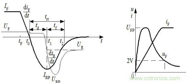 在開關電源中常使用工頻整流二極管、高頻整流二極管、續流二極管等,由於這些二極管都工作在開關狀態,如圖所示,在二極管由阻斷狀態到導通工作過程中,將產生一個很高的電壓尖峰VFP;在二極管由導通狀態到阻斷工作過程中,存在一個反向恢複時間trr,在反向恢複過程中,由於二極管封裝電感及引線電感的存在,將產生一個反向電壓尖峰VRP,由於少子的存儲與複合效應,會產生瞬變的反向恢複電流IRP,這種快速的電流、電壓突變是電磁幹擾產生的根源。