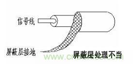 雙絞線、同(tong)軸(zhou)電(dian)纜(lan)都(dou)能(neng)有(you)效(xiao)的(de)抑(yi)製(zhi)電(dian)磁(ci)幹(gan)擾(rao)。在(zai)脈(mai)衝(chong)信(xin)號(hao)傳(chuan)輸(shu)線(xian)路(lu)中(zhong)常(chang)使(shi)用(yong)雙(shuang)絞(jiao)線(xian),控(kong)製(zhi)輔(fu)助(zhu)電(dian)源(yuan)線(xian)和(he)傳(chuan)感(gan)器(qi)信(xin)號(hao)線(xian)最(zui)好(hao)用(yong)雙(shuang)絞(jiao)屏(ping)蔽(bi)線(xian)。因(yin)為(wei)雙(shuang)絞(jiao)線(xian)兩(liang)根(gen)線(xian)之(zhi)間(jian)有(you)很(hen)小(xiao)的(de)回(hui)路(lu)麵(mian)積(ji),而(er)且(qie)雙(shuang)絞(jiao)線(xian)的(de)每(mei)兩(liang)個(ge)相(xiang)鄰(lin)的(de)回(hui)路(lu)上(shang)感(gan)應(ying)出(chu)的(de)電(dian)流(liu)具(ju)有(you)大(da)小(xiao)相(xiang)等(deng)、方(fang)向(xiang)相(xiang)反(fan),產(chan)生(sheng)的(de)磁(ci)場(chang)相(xiang)互(hu)抵(di)消(xiao),這(zhe)樣(yang)就(jiu)可(ke)以(yi)減(jian)小(xiao)因(yin)輻(fu)射(she)引(yin)起(qi)的(de)差(cha)模(mo)幹(gan)擾(rao),不(bu)過(guo)雙(shuang)絞(jiao)線(xian)絞(jiao)合(he)的(de)圈(quan)數(shu)最(zui)好(hao)為(wei)偶(ou)數(shu),且(qie)每(mei)單(dan)位(wei)波(bo)長(chang)所(suo)絞(jiao)合(he)的(de)圈(quan)數(shu)愈(yu)多(duo),消(xiao)除(chu)耦(ou)合(he)的(de)效(xiao)果(guo)愈(yu)好(hao)。使(shi)用(yong)時(shi)注(zhu)意(yi)雙(shuang)絞(jiao)線(xian)和(he)同(tong)軸(zhou)電(dian)纜(lan)兩(liang)端(duan)不(bu)能(neng)同(tong)時(shi)接(jie)地(di),隻(zhi)能(neng)單(dan)端(duan)接(jie)地(di),而(er)對(dui)屏(ping)蔽(bi)線(xian),屏(ping)蔽(bi)層(ceng)兩(liang)端(duan)接(jie)地(di)能(neng)既(ji)能(neng)屏(ping)蔽(bi)電(dian)場(chang)還(hai)能(neng)屏(ping)蔽(bi)磁(ci)場(chang),單(dan)端(duan)接(jie)地(di)隻(zhi)能(neng)屏(ping)蔽(bi)電(dian)場(chang)。使(shi)用(yong)同(tong)軸(zhou)電(dian)纜(lan)時(shi)還(hai)要(yao)注(zhu)意(yi),其(qi)屏(ping)蔽(bi)層(ceng)必(bi)須(xu)完(wan)全(quan)包(bao)覆(fu)信(xin)號(hao)線(xian)接(jie)地(di),即(ji)接(jie)頭(tou)與(yu)電(dian)纜(lan)屏(ping)蔽(bi)層(ceng)必(bi)須(xu)3600搭接,才能有效屏蔽電磁場,如圖4所示,信號線裸露部分仍可以與外界形成互容耦合,降低屏蔽效能。