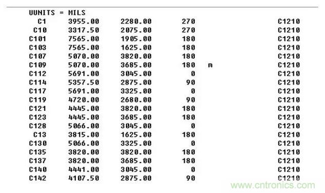 大家可以清晰可以的看到第一行表示的是單位mil。第一列是器件位號,第二列是X軸坐標,第三列是Y軸坐標,第四列是旋轉度數,第五列是表示器件放在top麵(空白)或者bottom麵(m-Mirror的縮寫),第六列是器件封裝名。對於一個器件的定位信息來說,直接 感覺一下,似乎我們隻需知道是哪個器件也就是器件位號,放置在哪一麵,也就是在表麵還是底麵,旋轉度數以及具體的xyzuobiao,xinxijiuquanle。duiyushinazhongfengzhuangleixingsihubushibixude,nameshuodaozhe,woxiangdajiayejiumingbaizaiyudaoshangshuqingkuangshi,keyijinxingyixiegengweijiandandecaozuole。