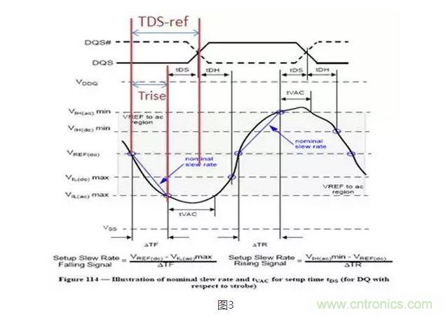 如圖3,建立時間等於TDS-ref(在ref處的建立時間)減去Trise(Vref到VIH AC的時間)。規範中的基準值是預減去了這個Trise的,這個預減去的值是特定slew rate為1V/ns時的值,若判斷門限是AC175,則預減去175ps。請再看圖2,當slew rate等於1V/ns時,derating為0,不需要調整;當slew rate大於1V/ns(更快)時,從Vref到Vih(ac)所需的時間就少,預減多了,要補回來,所以取值為正;當slew rate小於1V/ns(更慢)時就預減少了,所以取值為負。從圖2中的取值關係推導出取值公式為Derating @AC175 = 175ps - 175mV/SR,大家可以代入計算一下試試。如果判斷門限是AC150或其他都可以套用。而保持時間是DC門限,其公式為Derating @DC100 = 100ps - 100mV/SR。
