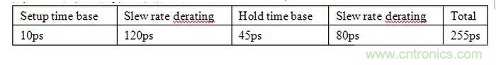 簡單,可以用上麵的公式計算出derating值,但上述公式隻適用於>1v/ns的情況。然後和基準值相加得到總的建立保持時間,如下表,總共所需的建立保持時間的總和是255ps。這樣就可以準確的估算時序裕量了。