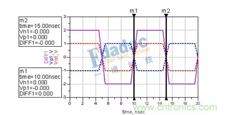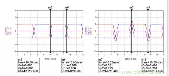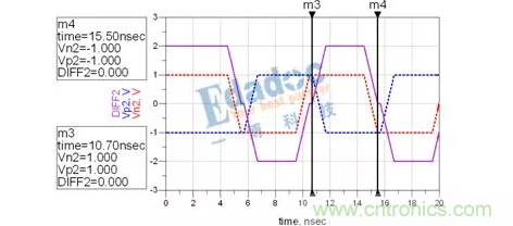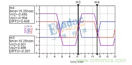 可以看到,兩次經過零軸的時間由之前的5ns變成了4.8ns。或者說,N與P的長度差,引起了0.04UI的抖動。這時候,串行的Clock recovery該花點心思才能將其時鍾解出來了。而且在進行時鍾與數據對位的時候,是對在0V這個階梯的左邊還是對在右邊呢?這又會引起時序問題的出現。