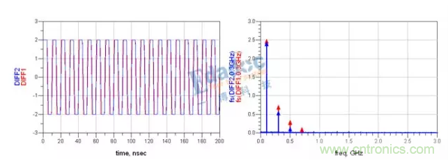 圖中,藍色的是N與P不等長的信號,可以看到,當兩線不等長的時候,差分信號的能量明顯變弱了,那多的能量去哪裏了呢?