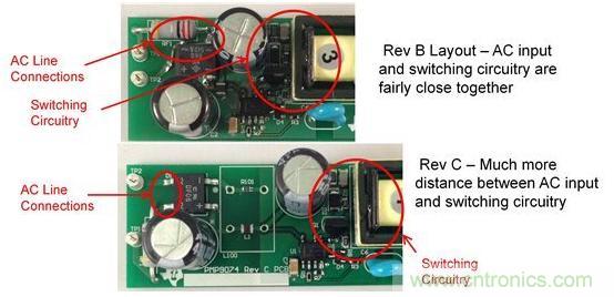 圖1.讓輸入布線與具有高 dV/dt 的節點靠得太近會增加傳導 EMI。
