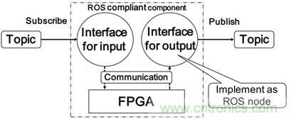 Rosbridge為ROS與FPGA的聯通提供了一種溝通機製,但是在這種機製中,ROS Node並不能運行在FPGA上,而且通過JSON API的連接機製也帶來了一定的性能損耗。為了讓FPGA與ROS更好的耦合,最近日本的研究人員提出了ROS-Compliant FPGA的設計,讓ROS Node可以直接運行在FPGA上。如圖10所示,在這個設計中,FPGA了實現一個輸入的接口,這個接口可以直接訂閱ROS的topic,使數據可以無縫連接流入FPGA計算單元中。另外,FPGA上也實現了一個輸出接口, 讓FPGA上的ROS Node可以直接發表數據,讓訂閱這個topic的其他ROS Node可以直接使用FPGA產出的數據。在這個設計中,開發者隻要把自己開發的FPGA計算器插入到ROS-compliant的FPGA框架中,便可以無縫連接其他ROS Node。