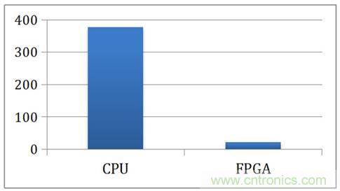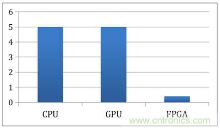 為了讓讀者了解FPGA對深度學習的加速以及節能,我們下麵關注北京大學與加州大學的一個關於FPGA加速CNN算法的合作研究。圖7展示了FPGA與CPU在執行CNN時的耗時對比。在運行一次迭代時,使用CPU耗時375毫秒,而使用FPGA隻耗時21毫秒,取得了18倍左右的加速比。假設如果這個CNN運算是有實時要求,比如需要跟上相機幀率(33毫秒/幀),那麼CPU就不可以達到計算要求,但是通過FPGA加速後,CNN計算就可以跟上相機幀率,對每一幀進行分析。