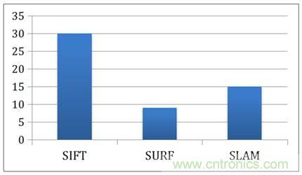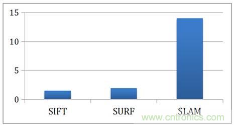 為了讓讀者了解FPGA對特征提取與位置追蹤的加速以及節能,下麵我們關注加州大學洛杉磯分校的一個關於在FPGA上加速特征提取與SLAM算法的研究。圖5展示了FPGA相對CPU在執行SIFT feature-matching、SURF feature-matching以及SLAM算法的加速比。使用FPGA後,SIFT與SURF的feature-matching分別取得了30倍與9倍的加速,而SLAM的算法也取得了15倍的加速比。假設照片以30FPS的速度進入計算器,那麼感知與定位的算法需要在33毫秒內完成對一張圖片的處理,也就是說在33毫秒內做完一次特征提取與SLAM計算,這對CPU會造成很大的壓力。用了FPGA以後,整個處理流程提速了10倍以上,讓高幀率的數據處理變得可能。