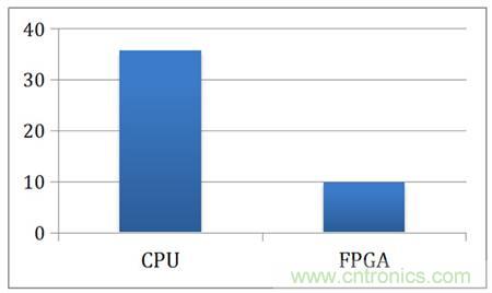 為了讓讀者對FPGA加速有更好的了解,我們總結了微軟研究院2010年對BLAS算法的FPGA加速研究。BLAS是矩陣運算的底層庫,被廣泛運用到高性能計算、機器學習等領域。在這個研究中,微軟的研究人員分析了CPU、GPU以及FPGA對BLAS的加速以及能耗。圖2對比了FPGA以及CPU、GPU執行GaxPy算法每次迭代的時間,相對於CPU,GPU與FPGA都達到了60%的加速。圖中顯示的是小矩陣運算,隨著矩陣的增大,GPU與FPGA相對與CPU的加速比會越來越明顯。