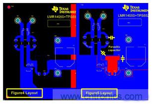 圖4和圖5之間噪聲結果的不同主要是由於PCB布線差異所致,如圖6所示。圖5的布線中(圖6的右側),大麵積覆銅(GND)包圍著DM濾波器,並和Vin走線形成了一些寄生電容。 這些寄生電容為高頻信號旁路濾波器提供了有效的低阻抗路徑。 因此,為了最大限度地提高濾波器的性能,需要移除濾波器周圍所有的覆銅,如圖6左側的布線。