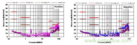 圖3顯示了增加一個DM濾波器後的EMI結果。 從圖中可以看出,DM濾波器衰減了中頻段DM噪聲(2MHz至30MHz)近35dBμV/ m。此外高頻段噪聲(30MHz至100MHz)也有所降低,但仍超過限製水平。這主要是因為DM濾波器對於高頻段CM噪聲的濾除能力有限。