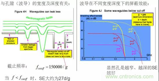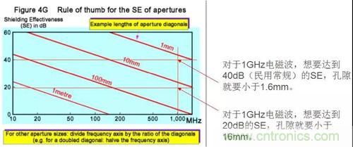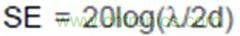 在一個完美的屏蔽殼體上開一個洞,相當於構成一個半波共振縫隙天線,屏蔽效能SE與孔的最大尺寸d、電磁波波長λ關係如下: