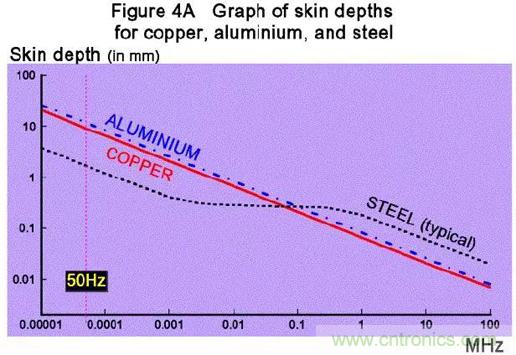 上圖:不同頻率下三種金屬的趨膚效應深度(頻率越高,深度越淺,越趨膚);趨膚效應以傳導的角度看,是希望趨膚深度深的,那表示導線的利用率高;但是對於屏蔽,是希望趨膚深度淺的,這樣就能以較薄的金屬屏蔽更多的電磁頻段;50Hz的趨膚深度5~15mm,很難屏蔽……