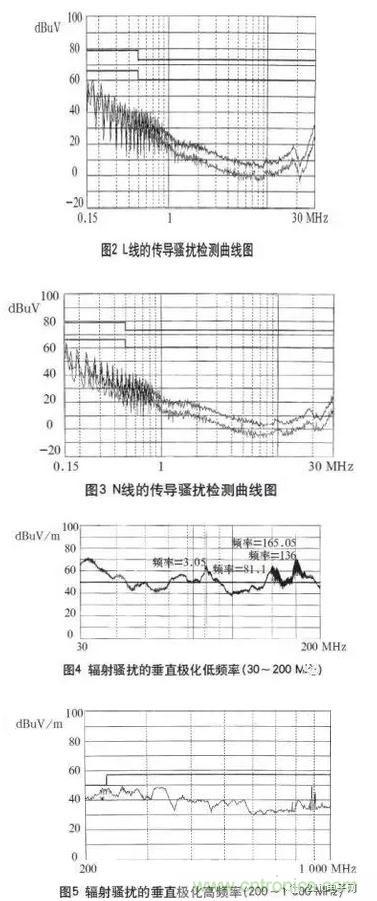 在3m法電波暗室對試驗樣機進行測試,其L、N線的傳導騷擾檢測曲線如圖2、3所示,輻射騷擾的垂直極化掃描曲線如圖4、5所示。