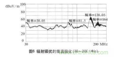 本開關電源一次通過了傳導騷擾的測試,測試波形如圖2、3所示。輻射騷擾高頻段230~1000MHz也測試合格,如圖5所示。隻是在30~200MHz頻段範圍內的垂直極化指標超標,最大超標20dB,如圖4所示。