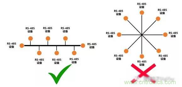 為了避免信號反射,在多個RS-485連接時,支路長度(StubLength)越短越好。同時要避免其他類型的連接,比如星型連接。