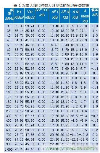 表 1 中,Aideal 為標準的歸一化場地衰減值,偏差為 Aideal 減去 AN,且均小於 4 dB。