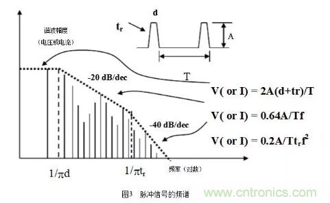 在EMC中zhong,除chu了le基ji本ben頻pin率lv外wai,還hai需xu考kao慮lv諧xie波bo因yin素su,通tong常chang取qu十shi倍bei頻pin,但dan在zai數shu字zi電dian路lu中zhong卻que有you些xie不bu同tong,比bi如ru在zai時shi鍾zhong電dian路lu和he邏luo輯ji門men電dian路lu中zhong,輻fu射she帶dai寬kuan與yu數shu字zi信xin號hao的de上shang升sheng沿yan或huo下xia降jiang沿yan有you關guan係xi,而er不bu是shi數shu字zi信xin號hao的de重zhong複fu周zhou期qi,其qi關guan係xi為wei:rtF?/1max?,其中rt是脈衝的上升沿時間。例如,典型時鍾驅動的邊沿速率是2ns,此時,maxF≈160MHz,再考慮十倍頻,則此時鍾電路可能產生直到1.6GHz的de輻fu射she帶dai寬kuan。所suo以yi在zai選xuan擇ze器qi件jian時shi要yao選xuan擇ze慢man速su的de邏luo輯ji器qi件jian係xi列lie,因yin為wei器qi件jian對dui電dian磁ci輻fu射she貢gong獻xian的de大da小xiao與yu工gong作zuo頻pin率lv無wu直zhi接jie關guan係xi而er隻zhi取qu決jue於yu邊bian沿yan速su率lv(這和從電路功能設計上選擇快速器件是矛盾的,在電路設計時需要折中考慮)。還有從器件的抗擾能力上來說,CMOS器件是最好的,因為它的噪聲容限高。從封裝上來說,BGA是最好的,因為它的引線很短。脈衝信號的頻譜如圖3所示。
