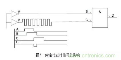 (3)保證信號在PCB上可靠的傳輸,確保信號的完整性。這裏麵主要的問題一般包括時延、阻抗不匹配、地彈跳、串(chuan)音(yin)等(deng)。這(zhe)不(bu)但(dan)影(ying)響(xiang)到(dao)電(dian)子(zi)器(qi)件(jian)的(de)穩(wen)定(ding)工(gong)作(zuo),還(hai)會(hui)產(chan)生(sheng)電(dian)磁(ci)幹(gan)擾(rao)。一(yi)般(ban)在(zai)高(gao)速(su)邏(luo)輯(ji)設(she)計(ji)中(zhong)最(zui)容(rong)易(yi)碰(peng)到(dao)時(shi)延(yan)問(wen)題(ti),處(chu)理(li)不(bu)好(hao)會(hui)產(chan)生(sheng)不(bu)希(xi)望(wang)的(de)脈(mai)衝(chong)幹(gan)擾(rao)。傳(chuan)輸(shu)時(shi)延(yan)對(dui)信(xin)號(hao)的(de)影(ying)響(xiang)如(ru)圖(tu)5所示。