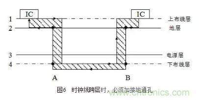 在zai布bu線xian時shi盡jin量liang少shao穿chuan過guo孔kong,因yin為wei過guo孔kong阻zu抗kang和he線xian阻zu抗kang不bu一yi樣yang,存cun在zai阻zu抗kang突tu變bian,從cong而er產chan生sheng駐zhu波bo使shi信xin號hao變bian壞huai,容rong易yi形xing成cheng輻fu射she,尤you其qi是shi在zai時shi鍾zhong需xu要yao穿chuan層ceng時shi,要yao做zuo技ji術shu處chu理li,時shi鍾zhong線xian跨kua層ceng時shi的de處chu理li如ru圖tu6所示。