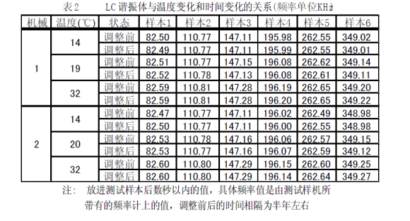 根據本文中所推出的原理試作了LC諧振頻率測試機分別對6個種類LC諧振體樣本(產品)進行測試。本LC諧振測試機已應用在6個種類LC諧振體的生產和產品檢驗上。具體結果參照表1和表 2。