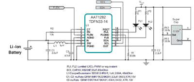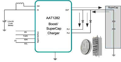 為更好地實現這一目標, AAT1282具有防止啟動時過大尖峰電流衝擊的內置電路、一個固定的800mA輸入電流限製器、以及一個超級電容充滿電後的負載斷開電路。其輸出電壓受限於內部過壓保護電路,可防止轉換器和超級電容免受一個開路LED(開路條件下)的損害。