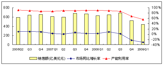 如果說2008年行業進入冬天,那麼2009年就是深冬,至少目前來看,2009年一季度行業發展速度仍在快速下滑,根據SIA的統計,2009年一季度全球半導體市場銷售額與2008年一季度相比下降29.9%,就算與發展緩慢的2008年四季度相比,市場仍然下滑了15.7%。再從產能利用率來看,根據SICAS統計,從2008年Q3以來,全球半導體產能利用率就開始出現明顯下滑,而到2009年一季度,全球半導體產能利用率仍然在下滑,目前的產能利用率已經在60 %以下,全球半導體行業在2009年的發展並沒有好轉。