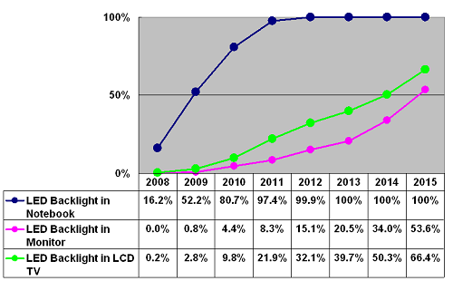 同時,2013年采用LED背光的大尺寸(指10寸及以上尺寸)麵板出貨量將從2009年約8千490萬片成長到4億3千480萬片,將占LED背光市占率估計為54.3%,LED背光將成為市場主流規格。其中notebook PC將是LED背光主要應用,依據DisplaySearch分析到了2012年百分之百notebook PC都將采用LED背光。