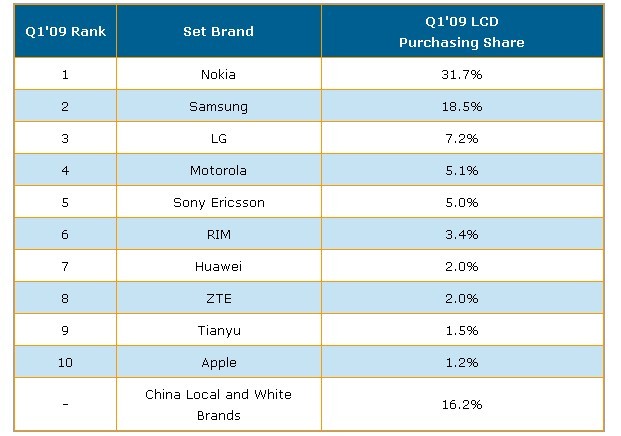 接著從麵板出貨到品牌廠商情況來看品牌排名。2009年第一季Nokia麵板需求量達2億7千6百萬片,出貨量市占率高達31.7%穩坐市場龍頭位置,Samsung與LG則分居第二與第三位,Motorola市占率則持續下滑,第一季市占率僅有5.1%,較2008年第四季下滑了2.3%。競爭力持續提高的中國廠商如華為、中興通訊與天語等麵板需求比率則在1.5%到2%之間。