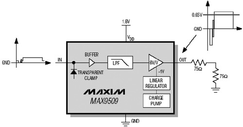 當視頻濾波放大器采用1.8V電源電壓工作時,必須采用DirectDrive技術。采用電壓模式輸出級的放大器必須至少提供2VP-P擺幅,才能輸出複合視頻信號。傳統的放大器采用1.8V單電源供電時,沒有足夠的餘量產生2VP-P輸出信號。而采用DirectDrive後,集成反向電荷泵將產生一個嘈雜的-1.8V電壓;負電壓線性穩壓器將-1.8V電壓穩定到-1V,降低了電荷泵噪聲。因此,實際采用-1V~+1.8V的電壓供電時,MAX9509剛好有足夠的餘量輸出2VP-P視頻信號。