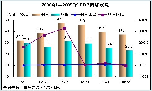 奧維谘詢(AVC)數據表明:2009年上半年等離子彩電國內市場零售量規模為76.8萬台、占整體彩電市場的5.1%,零售額規模為49.2億元,占整體彩電市場的9.1%,分別較去年同期相比變化8.8%、-12.8%。