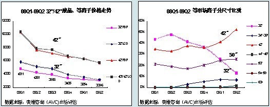 在以上雙重因素的作用下,等離子市場32、42和50英寸產品三足鼎立的局勢被打破,出現了42英寸占據半壁江山的局麵。據奧維谘詢(AVC)數據顯示:32英寸產品比重已由08Q1的43.4%跌至09Q2的13.0%,而42英寸產品則由34.7%攀升至52.4%。
