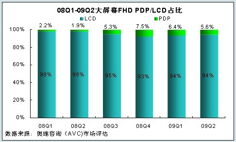 大屏幕等離子產品銷量的增加、全高清技術滲透率的提升,以及大屏幕全高清等離子產品價格的持續走低等助推了等離子在40英寸以上大屏幕FHD市場占有率由2008年上半年的2.0%,上升至2009年上半年的6.0%,同比增加4.0%。競爭力持續增強的趨勢已經顯現。