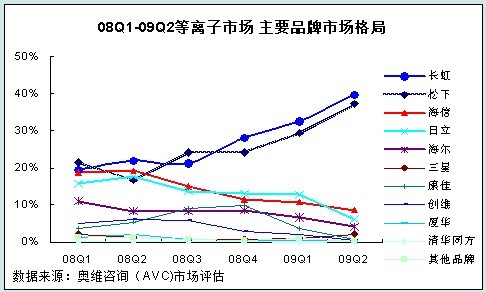 - 2009年上半年等離子市場長虹、鬆下市場占有率分別達35.4%、32.4%,二者合計達到67.8%