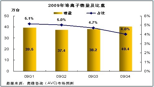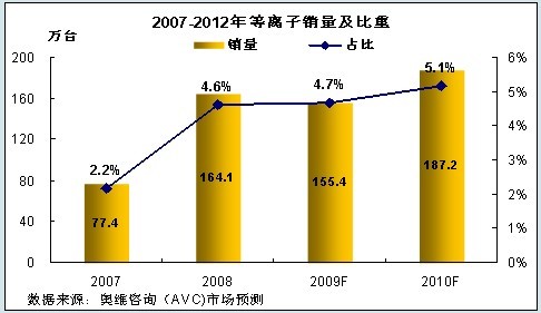 考慮到未來平板電視市場的走勢、結合等離子上下遊產業情況,奧維谘詢(AVC)預測:2009年全年等離子銷量為155.4萬台,與2008年的總量基本持平。2009年下半年,受液晶市場的規模優勢擠壓,第三、四季度等離子電視的銷量因彩電旺季到來將上升至78.6萬台,但占市場比重將下降至4.3%。