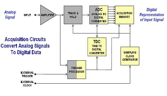 捕獲部分主要是由三顆芯片和一個電路組成,即放大器芯片,A/D芯片,存儲器芯片和觸發器電路,原理框圖如下圖2所示。被測信號首先經過探頭和放大器及歸一化後轉換成ADC可以接收的電壓範圍,采樣和保持電路按固定采樣率將信號分割成一個個獨立的采樣電平,ADC將這些電平轉化成數字的采樣點,這些數字采樣點保存在采集存儲器裏送顯示和測量分析處理。