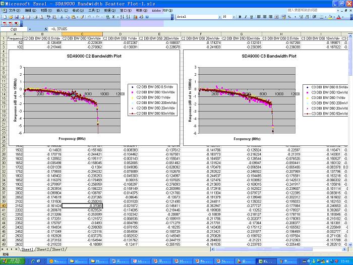 此外,在計量波特圖時需要對示波器每個檔位都進行計量,最終產生的波特圖是所有檔位的結果疊加在一起的。波特圖的計量是需要半天時間完成的,並不是想象中那麼輕鬆的工作。如圖8所示是力科SDA9000的波特圖,我特地將Excel中大量數據顯示給大家以使大家對校準的嚴謹性有深刻認識。 其垂直軸是-1dB/div, 疊加了10mv/div、20mv/div、50mv/div、200mv/div、500mv/div、1v/div等檔位的測試結果。 很多時候,我們的競爭對手會把他們的波特圖畫成-10dB/div、隻有一個檔位的測試結果拿給客戶,並和力科提供的這種-1dB/div、gezhongdangweidiezaiyiqixianshidejieguofangzaiyiqijinxingduibi,ranhoutamengaosukehu,tamendebotetugengpingtan,gengganjing,shenzhijianglikebotetushangmianmimimamadedianshuochengshi“噪音”大。這是有點貽笑天下的。 jingzhengduishouganyuyizaicaiyongzhezhongzuofa,zheshijiashezhongguodegongchengshidoumeiyoubianbieli,dulisikaonengli,shiduigongchengshiyanzhongbuzunzhongdegongranqipianxingwei。xiwangnengyinqidajiazhuyi。