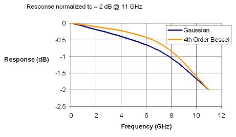Gaussian響應在-3dB之後仍衰減很慢。其優點是允許被測信號的更高頻率成分的諧波能量通過放大器(這是假定其有采樣率遠超過Nyquist),對於特別快的快沿測量有幫助。其缺點是在低頻段使被測信號嚴重衰減,特別是對3次諧波的衰減嚴重,導致眼圖測量中產生"花生眼"。