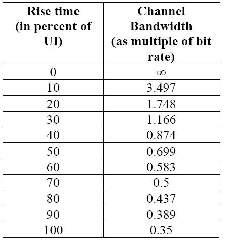 3, 對串行數據信號而言,數據比特率和上升時間是最重要的兩個因素。有一個非常好的評估準則是:示波器的帶寬 > 1.8 X 信號比特率. 在這個準則下,如果被測信號的上升時間>20%UI,那麼1.8關係的帶寬能捕獲信號能量的99%. 下麵的圖表給出了不同的上升時間和帶寬之間的關係。