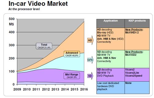 除了IDB-1394或者MOST等車內多媒體的網絡技術,車用的視頻處理器SoC市場也將在未來的數年內呈現高速增長,CAGR將達到21.4%,其中高端SoC的年平均增幅接近50%。NXP半導體汽車電子事業部的技術和應用市場經理徐偉傑表示,高端處理器能夠解碼高清和標清的視頻內容、支持藍光格式、接收全球不同的數字電視信號,並且應該具備高級的HMI和導航係統以及網絡聯接。而中端的產品應該支持標清內容的解碼、地麵數字電視和DVD播放等。