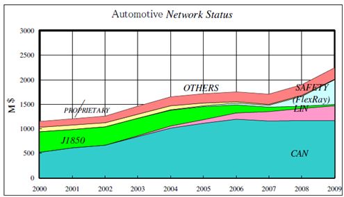當前汽車總線主要包括用於車身控製的CAN、LIN,用作底盤控製的FlexRay和信息娛樂係統中的IDB-1394和MOST。CAN依然占據汽車總線的主流地位,但是英飛淩車身電子係統市場部經理李世銘在IATF2009上表示,低速CAN的市場份額將會逐步被LIN所占領。