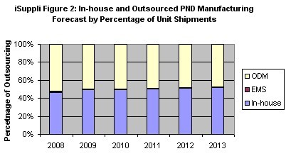 iSuppli公司對2008-2013年內部和外包PND製造業務的預測。
