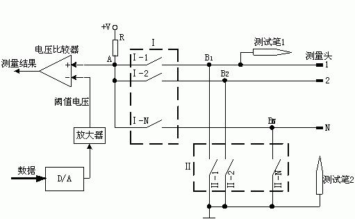 實shi現xian自zi動dong測ce量liang的de前qian提ti是shi將jiang被bei測ce元yuan件jian引yin腳jiao連lian入ru探tan測ce電dian路lu中zhong,為wei此ci探tan測ce設she備bei設she置zhi若ruo幹gan個ge測ce量liang頭tou,通tong過guo電dian纜lan引yin出chu,測ce量liang頭tou可ke掛gua接jie各ge種zhong測ce試shi夾jia具ju與yu元yuan件jian引yin腳jiao建jian立li連lian接jie,測ce量liang頭tou的de數shu量liang決jue定ding了le同tong一yi批pi連lian入ru探tan測ce電dian路lu的de引yin腳jiao數shu。然ran後hou在zai程cheng序xu控kong製zhi下xia探tan測ce儀yi按an組zu合he原yuan則ze依yi次ci將jiang被bei測ce"引腳對"一一納入測量通路。在測量通路中將"引腳對"之間的通/斷路狀況呈現為引腳間有無電阻,測量通路將其轉換為一個電壓量,由此判斷它們之間的通/斷路關係並加以記錄。