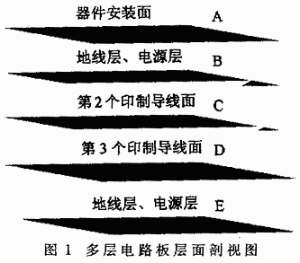 采用多層布線方式,電源、地線和信號分別占有獨立的層麵(如圖1所示),這樣由整個層麵構成的電源線和接地線阻抗相當低。電路板的分布電容由各層之間的距離和介電係數來決定,約為10~1000pF/cm2。圖1中的E層上下表麵經過絕緣處理,既能預防線路板向外輻射噪聲,又能防止線路板接受外來噪聲;tongshi,dianyuanxianbeimifengzaibannei,jihubujieshourenhewailaizaosheng,erqieneibujigegongdianmianzhijianyouhendadejingdiandianrong,xingchengzukangjididegongdianxianlu,jidaditigaolekangzaoxingneng。