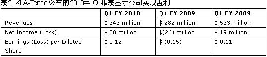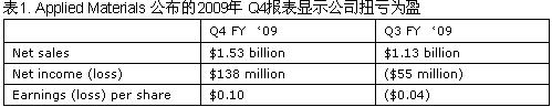 Applied Materials 近日公布的09年第4季財報顯示公司已扭虧為盈,淨收入實現1.38億美元,而上季虧損為5500萬美元。其Q4銷售額為15.3億美元,其中半導體設備銷售占6.56億美元,公司同時已收到了6.29億美元的半導體設備新訂單。