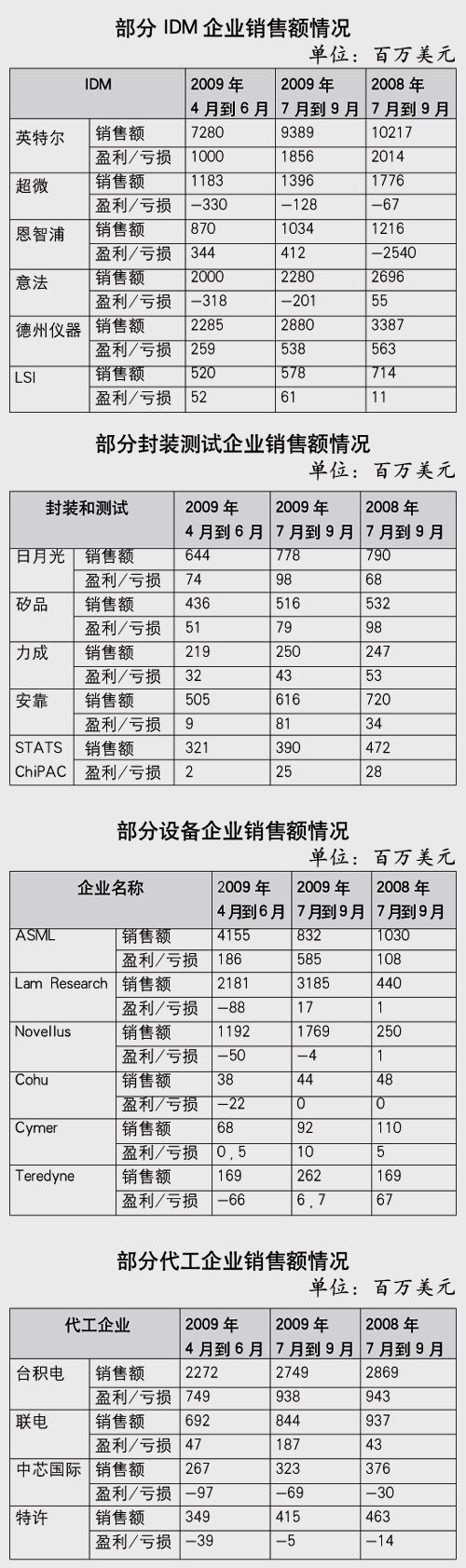 全球IDM(集成器件製造商)仍在複蘇之中。其中,英特爾運營表現不錯,第三季度贏利已回升到18.56億美元,接近去年同期的20.14億美元。英特爾的良好表現得益於全球PC市場的快速複蘇。另一家讓人們感興趣的公司是恩智浦。今年上任的總裁RickClemmer對公司進行了大刀闊斧的重組。他的戰略非常明確,隻保留有競爭力的項目。與此同時,在芯片製造方麵繼續執行Fab-Lite(輕製造)戰略。恩智浦今年第三季度財報顯示,雖然其銷售規模下降了,但純利已上升到4.12億美元,純利與銷售額之比達到39.8%。所以,恩智浦公司的行動應引起業界的關注。