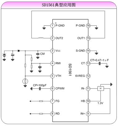SD1561基於士蘭微電子自行研發的0.8微米全互補BCD工藝製造,工作電壓範圍為4.5V~16V,最大工作電流1A。電路內置了同步整流功能並采用了DMOS管驅動,具有極低導通電阻和較高驅動效率,相同功率下,風扇的轉速可以比其他同類電路提高10%以上;高效率和低表麵溫度,使其更節能,更可靠。