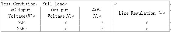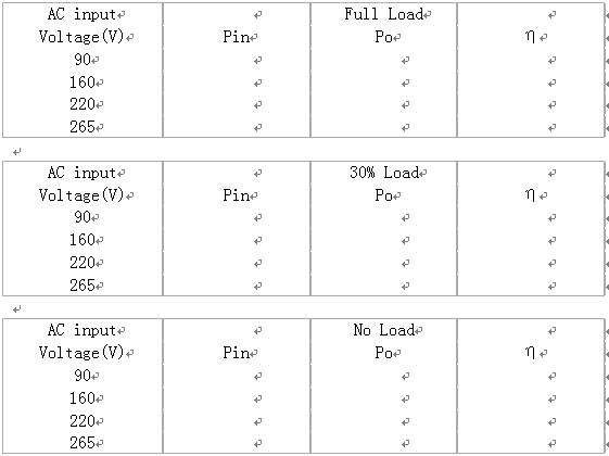 (1)交流輸入電壓90V,160V,220V,265V,輸出電流為100%Io,30%Io,空載時,測出對應的穩定的直流輸出電壓值Uo與對應的交流輸入功率Pin。