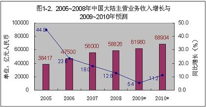 據工業和信息化部運行監測協調局統計,今年1~9月份,中國大陸電子製造業主營業務收入35,285億元,同比增長-1.8%;從1月份的-15%收窄到9月份的-1.8%,平均每月收窄1.65個百分點。據此平均值推算,並考慮到第四季度一般要好於前三個季度的情況,規模以上電子信息製造業主營業務收入,將在10月份接近去年的同期水平,到今年年底,製造業主營業務收入應能回升到3.2%,達到52,892億元(見圖1)。據工業和信息化部運行監測協調局統計,今年1~9月份軟件業收入6775億元,同比增長20.3%,。如能繼續保持20%左右的增長,今年的軟件收入可達9,088億元。則2009年電子信息行業的總營業額將達到61,980億元(約折合9,115億美元),總營業額將比2008年增長5.4%。預計2010年,在國際經濟回暖和繼續擴大內需的推動下,中國大陸電子信息產業主營業務總收入將實現11.2%左右的增長,達到68,904億元(約折合10,133億美元)(見圖2)。